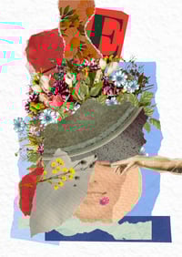 This vibrant contemporary collage artwork fuses classical references with modern textures, creating a dreamlike composition full of symbolism and detail. Torn paper layers reveal a fragmented female portrait surrounded by blossoming flowers, vintage patterns, and a reaching hand, evoking themes of femininity, rebirth and creation.