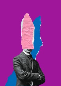 "Fragmento de Silêncio" is a bold and enigmatic composition that dissects identity through fragmentation and abstraction. A poised, vintage portrait of a suited man —rooted in tradition and formality — is abruptly disrupted by a jagged collage of torn paper where his face should be. The pink and white textures, crumpled and irregular, eclipse any trace of facial expression, while a vertical slash of cobalt blue behind him further intensifies the rupture. All of this unfolds against a rich, saturated purple backdrop.