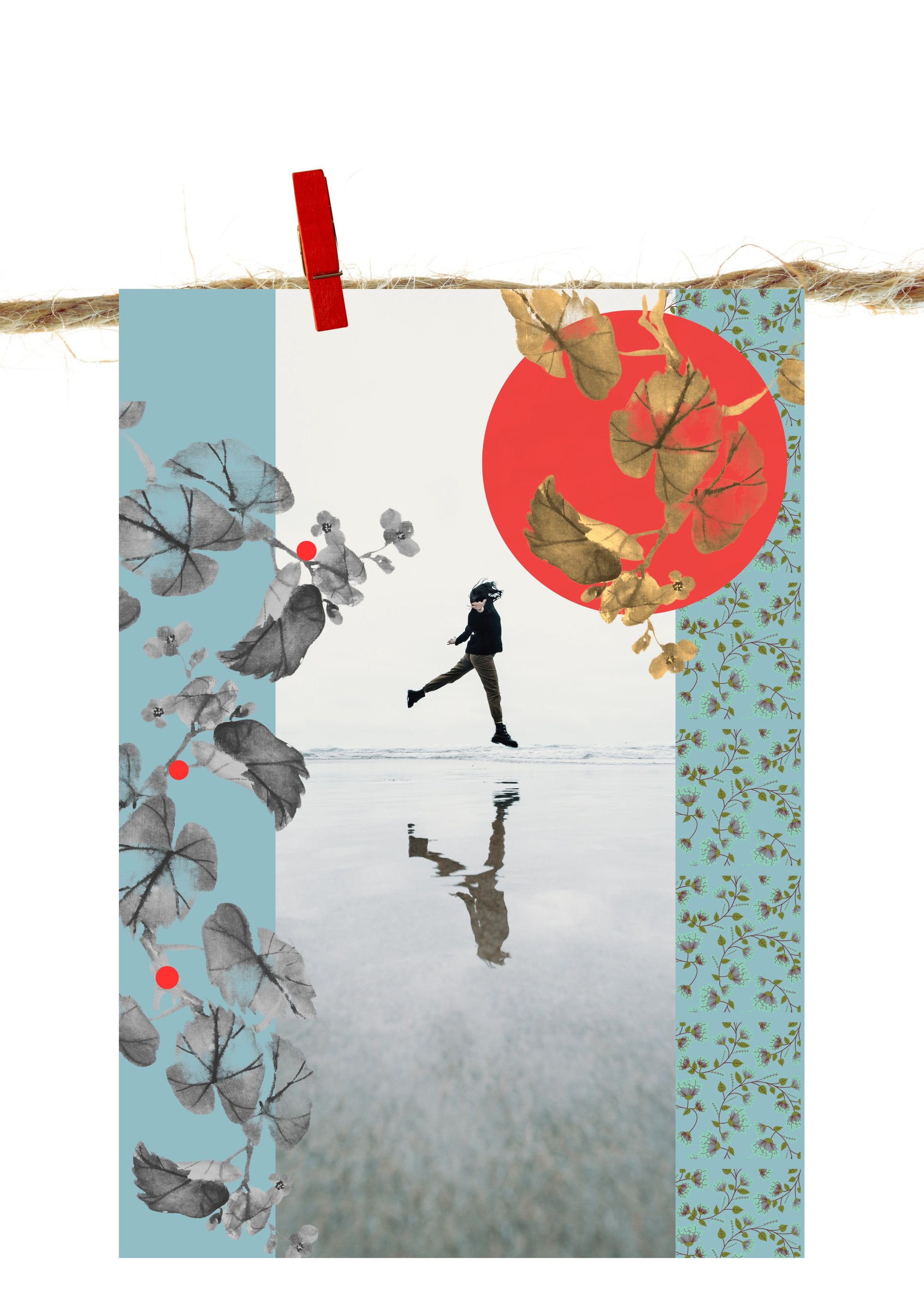"Leveza ao Sol" is a poetic collage that blends photography, floral patterns, and bold geometric forms. The artwork evokes freedom, balance, and harmony. A contemporary piece that captures movement and light, perfect for admirers of modern surreal and nature-inspired art.